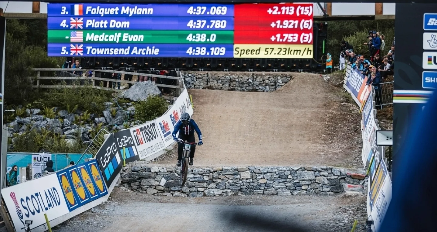 The skies opened up in the middle of the Elite Men’s race, bringing heavy rains to the already challenging track for about the top 30 riders. Dakotah Norton (Clinton, Tenn.; Intense Factory Racing) set the fastest time for Team USA, stopping the clock at 4:30.473, less than four seconds behind the winner earning him tenth. Next for the U.S. was Luca Shaw (Hendersonville, N.C.; Canyon Cllctv), who finished in 13th place with a time of 4:33.906. Austin Dooley (Yucaipa, Calif.; Commencal / Schwalbe) came down the track finishing 22nd. In 33rd place was Christopher Grice (Brevard, N.C.; Generation Specialized), finishing in 4:40.637. In his first international race after breaking his hip early in the season, Neko Mulally (Pisgah Forest, N.C.; Frameworks Racing) placed 52nd. After a crash in the woods section, Dante Silva (Chula Vista, Calif.; Canyon Cllctv) placed 61st.
