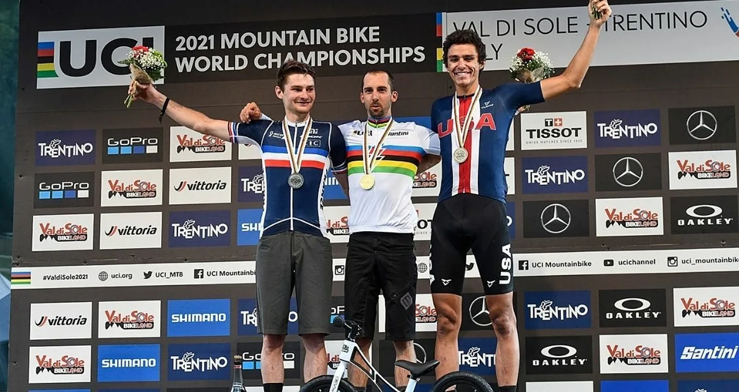 Christopher Blevins (Durango, Colo.; Trinity Racing) goes three-for-three. After his World Championship win in the Short Track yesterday, he was asked if he would still race in the E-bike race and said, “Yeah, just for fun.” No one was surprised to see him fighting for another medal. After a fourth-row call-up, Blevins had some work to do. After the first lap, he was sitting in eighth and consistently picked riders off each lap. He had the second-fastest lap time in the second lap and moved into fifth. At that point, he was right behind seasoned E-MTB racer Charlie Mullins (Grove City, Pa.). 2019 Masters Mountain Bike World Champion Mullins finished fourth in this event in 2019, sixth in 2020, and was riding in a solid fourth for most of today’s race. Blevins and Mullins rode several laps together until Blevins made his move, bridged the gap to third, and was suddenly in the fight for the bronze medal with Joris Ryf of Switzerland. Blevins started to ride away with one lap to go and finished with a four-second gap over Ryf to grab his third medal of the 2021 World Championships. Mullins went on to finish sixth.