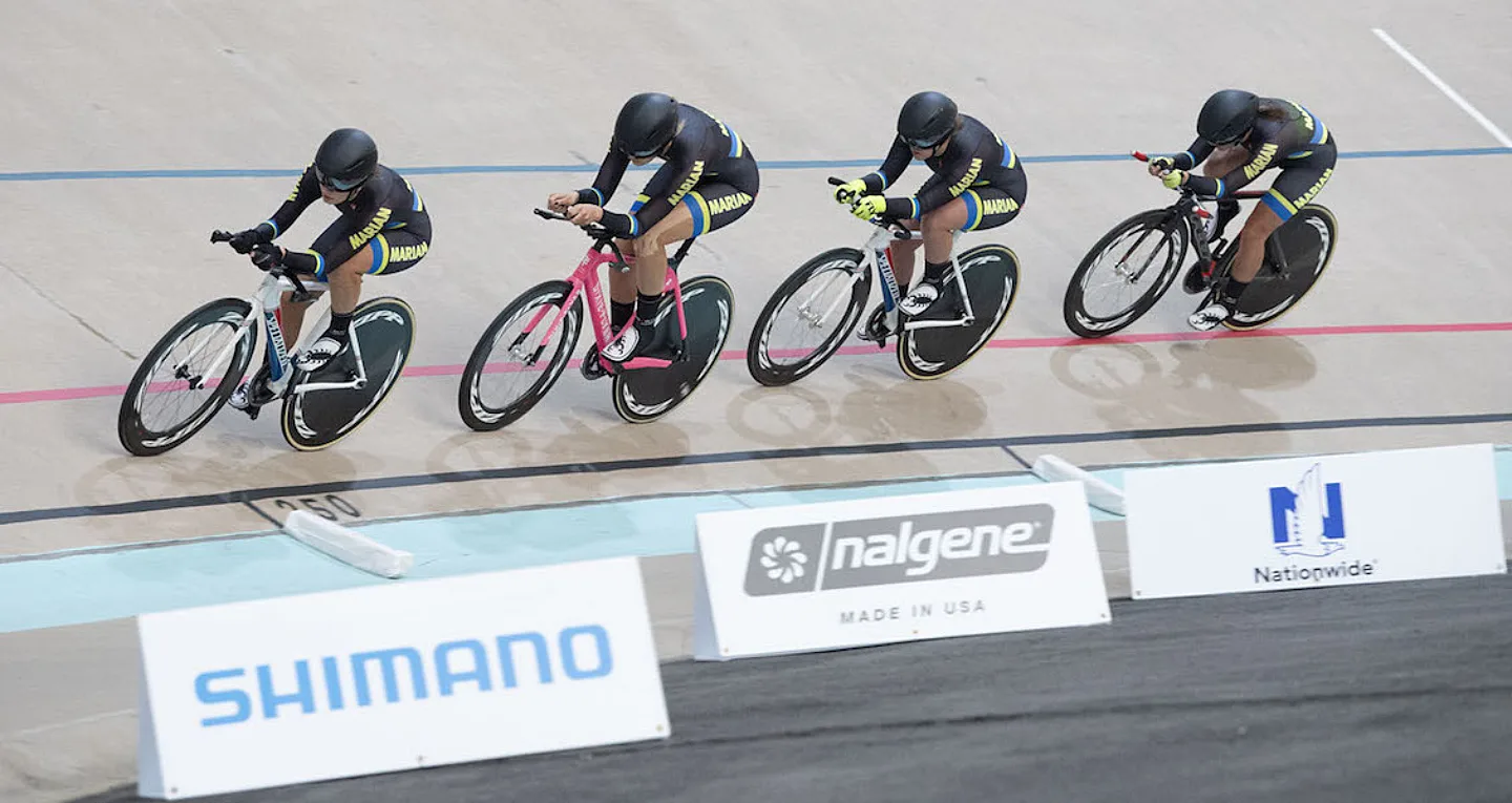 The Marian University women’s team pursuit squad of Alijah Beatty (Washington, Iowa), Birgit Morris (Grand Junction, Colo.), Laurel Rathbun (Monument, Colo.) and Emma Swartz (Madison, Wisc.) continued the school’s dominance in the event. In the ten-year history of the women’s team pursuit event at collegiate track national championships, no other school has been able to unseat Marian from the top step of the podium. This year’s squad clocked a time of 4:57.812, which was almost 20 seconds faster than last year’s winning time, of which Beatty and Rathbun were members of.