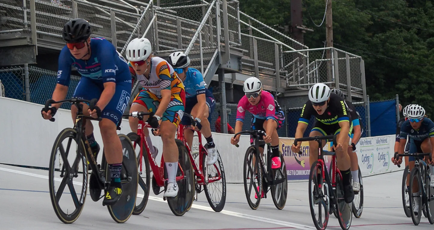 Elite endurance riders took on the 4-event omnium event. The four events comprising the best overall contest are the scratch race, the tempo race, the elimination race, and the points race, in that order. Valente controlled the Elite Women’s standings from the get-go, earning top places in all events. Kimberly Zubris (Alburtis, Pa.) entered the final event just behind Valente and defended her second place successfully. Elizabeth Stevenson (Rochester Hills, Mich.; Marian University) earned bronze.