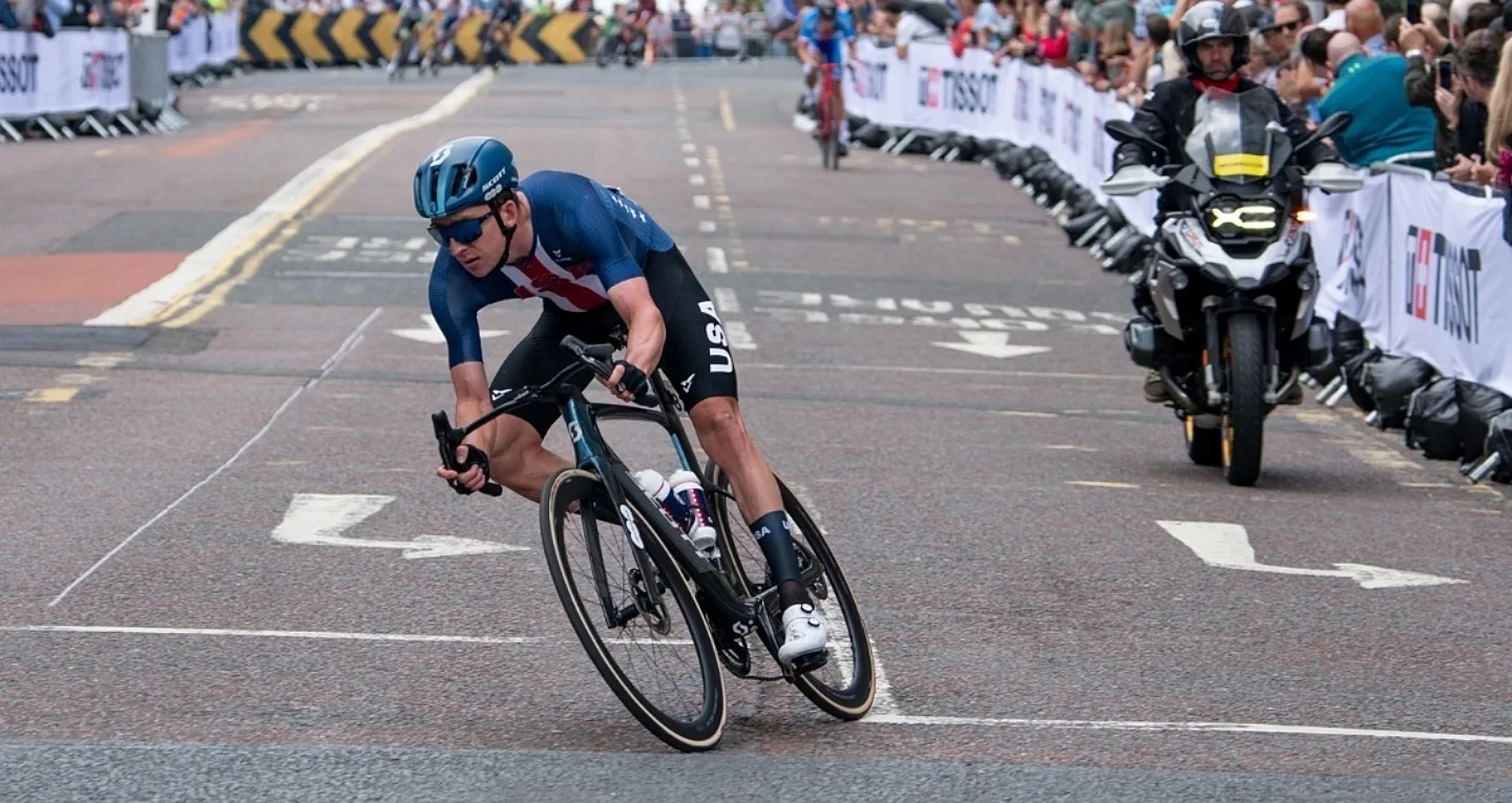 The American Elite Men’s team of Will Barta (Boise, Idaho; Movistar Team), Lawson Craddock (Houston; Team BikeExchange-Jayco), Neilson Powless (Roseville, Calif.; EF Education-EasyPost), Sean Quinn (Sherman Oaks, Calif.; EF Education-EasyPost), Kevin Vermaerke (Rancho Santa Margarita, Calif.; Team DSM), and Larry Warbasse (Traverse City, Mich.; AG2R Citroen Team) lined up in beautiful Edinburgh to kick off today's road race. The men embarked on their journey through the hills of Edinburgh and covered a total of 271 kilometers. The majority of the race wound through the fan-packed streets of Glasgow City Center, completing ten circuits around the city. The Americans battled their competitors all day long. Vermaerke was the first of Team USA to get into a break. Little did he know he’d be at the front of the race for over 150 kilometers. Vermaerke’s break was eventually caught at a little under 100 kilometers to go. Craddock and Powless displayed remarkable determination as they trailed behind, sticking with every chase group that emerged. At 70 kilometers to go, things began to change. In a bold move, Tadej Pogačar (SLO) unleashed a fierce attack; at the same time, Vermaerke's poorly timed flat tire forced him to lose ground. Powless responded quickly to the attack and was able to make it into the break.