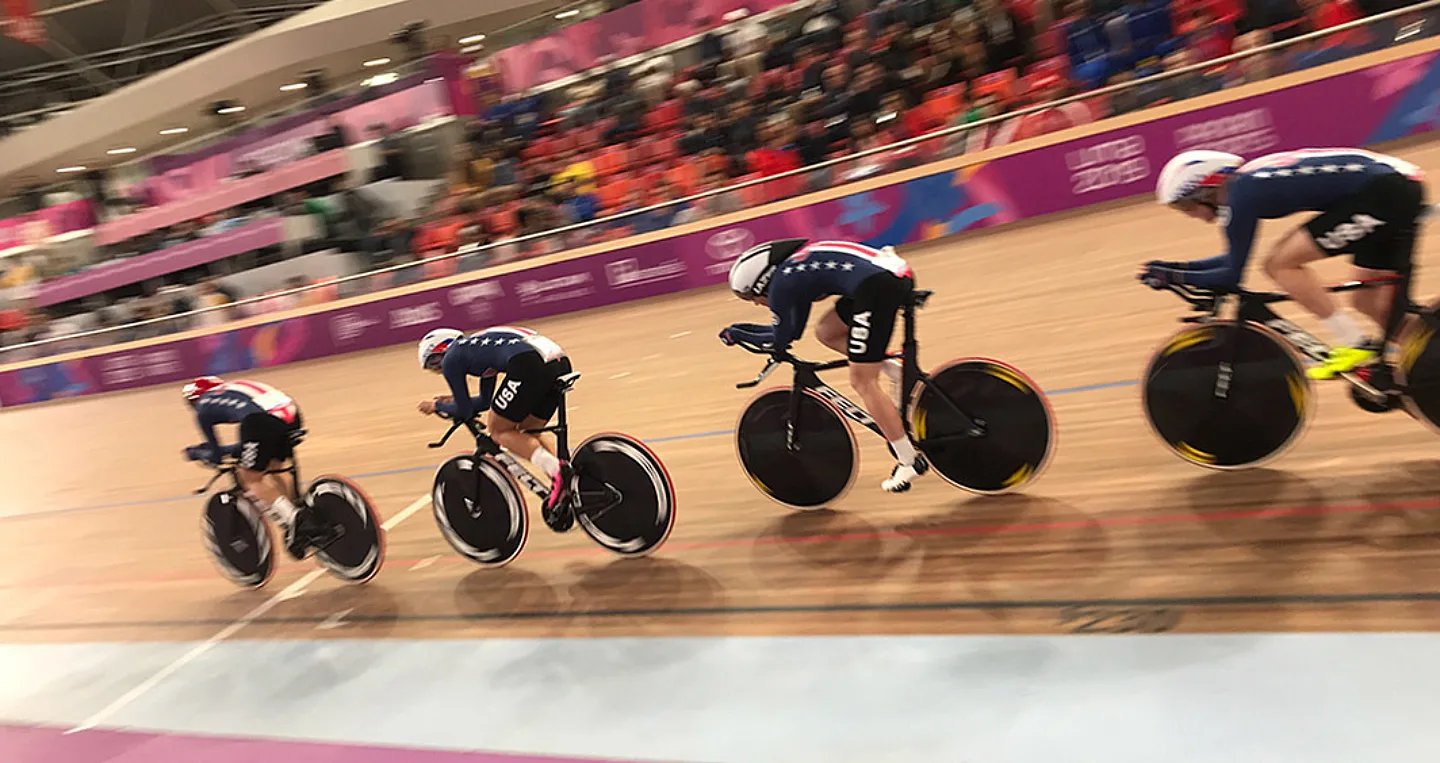 The competition started in the velodrome where the 11 track cyclists, Christina Birch (Los Angeles), John Croom (Colorado Springs, Colo.), Chloe Dygert-Owen (Brownsville, Ind.), Kimberly Geist (Emmaus, Calif.), Adrian Hegyvary (Ashville, N.C.), Daniel Holloway (Boulder, Colo.), Gavin Hoover (Redondo Beach, Calif.), Ashton Lambie (Lincoln, Neb.), Jennifer Valente (San Diego), and Lily Williams (Ashville, N.C.), and Danny Summerhill (reserve) (Centennial, Colo.), competed across six different events winning five gold medals and one silver.